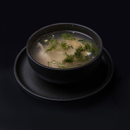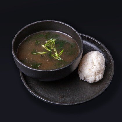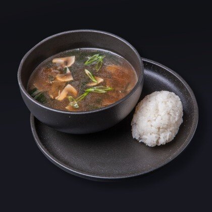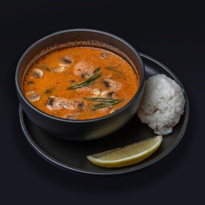 Бульон том ям, рис, шиитаке, лук зелёный, курица,лимон, помидоры черри