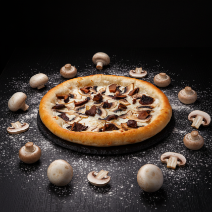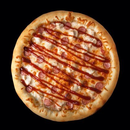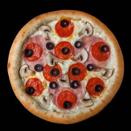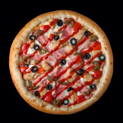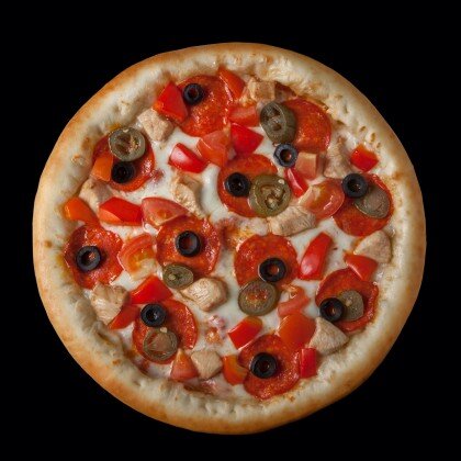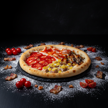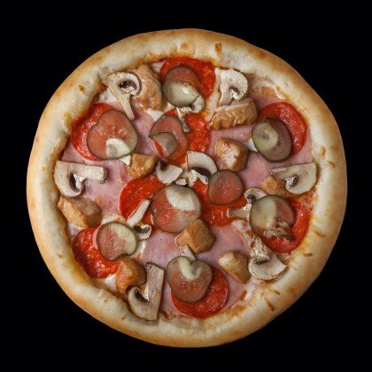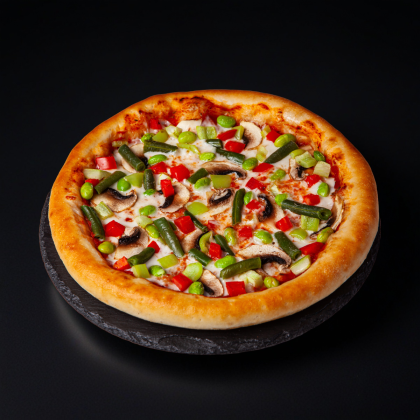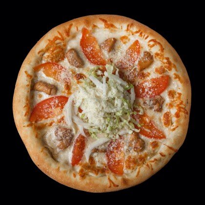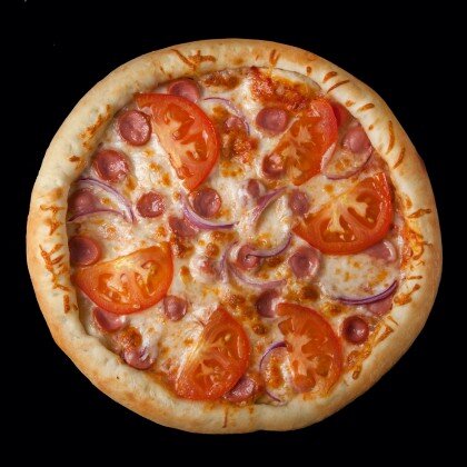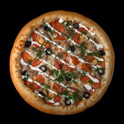Тесто, соус томатный, моцарелла, помидоры, базелик