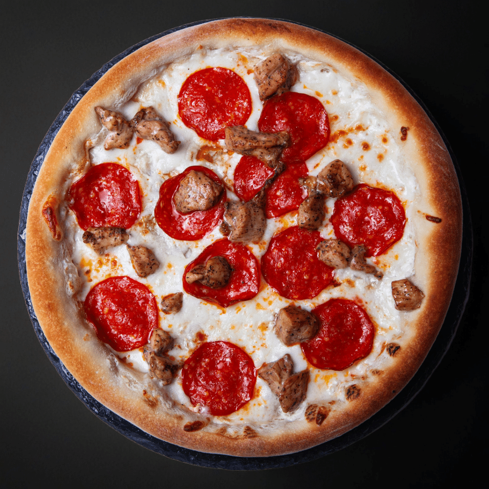 Соус сливочный, моцарелла , пепперони, филе кур., пармезан