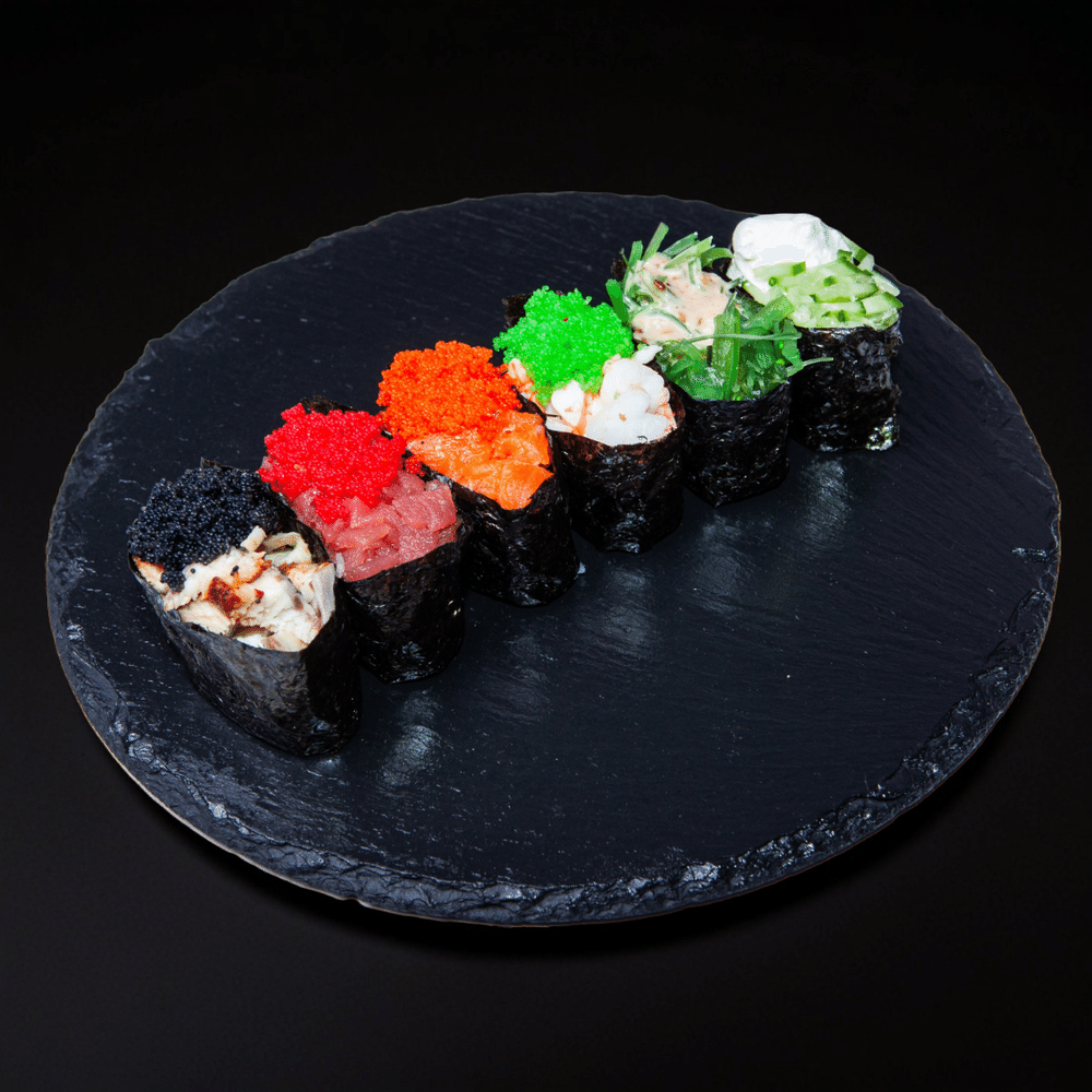 Гункан с креветкой, гункан с лососем, гункан с угрём, гункан с огурцом, гункан с тунцом,, гункан с чукой