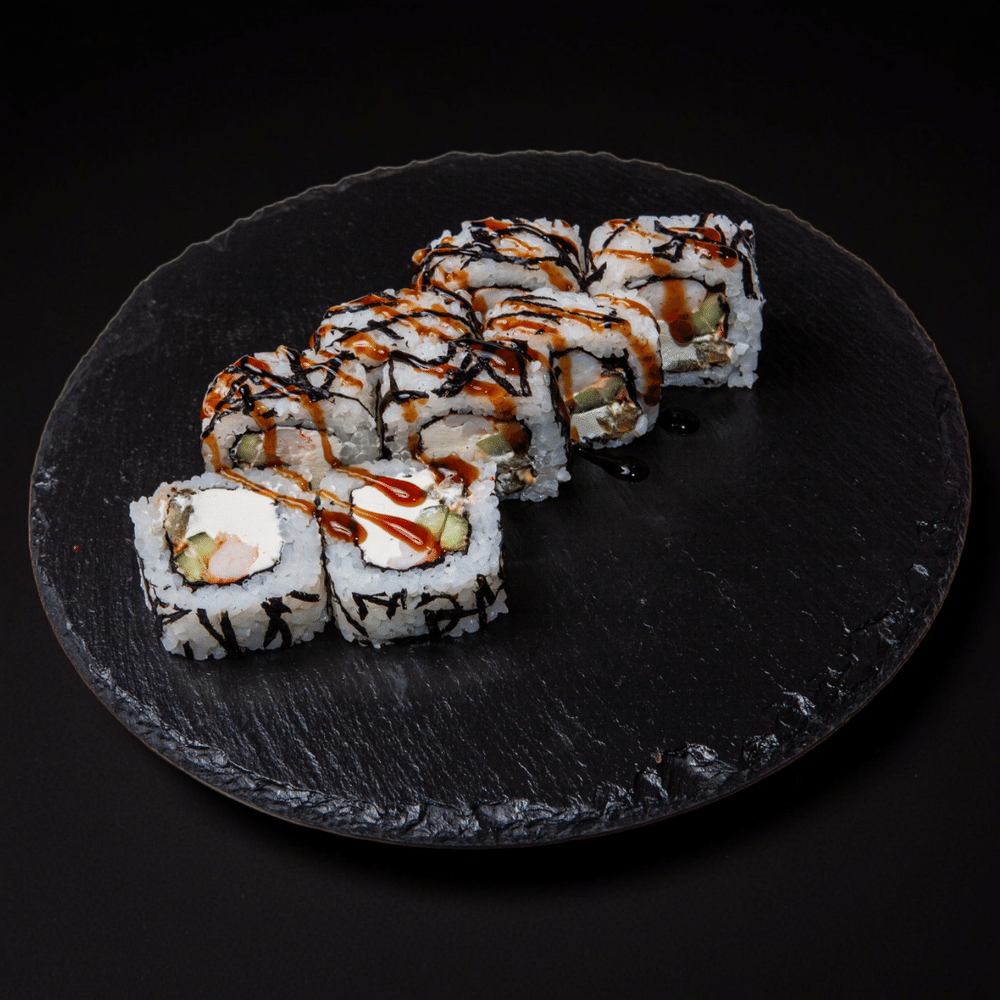 Креветка, рис, нори, сыр сливочный, огурец, халапеньо , соус спайси, соус терияки